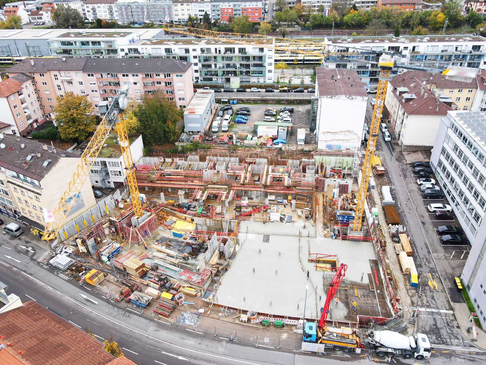 In the centre of Pforzheim, a new complex of mixed residential and commercial buildings and a one-and-a-half-storey underground car park is being built on the Durlacher Straße/Belfortstraße corner site.