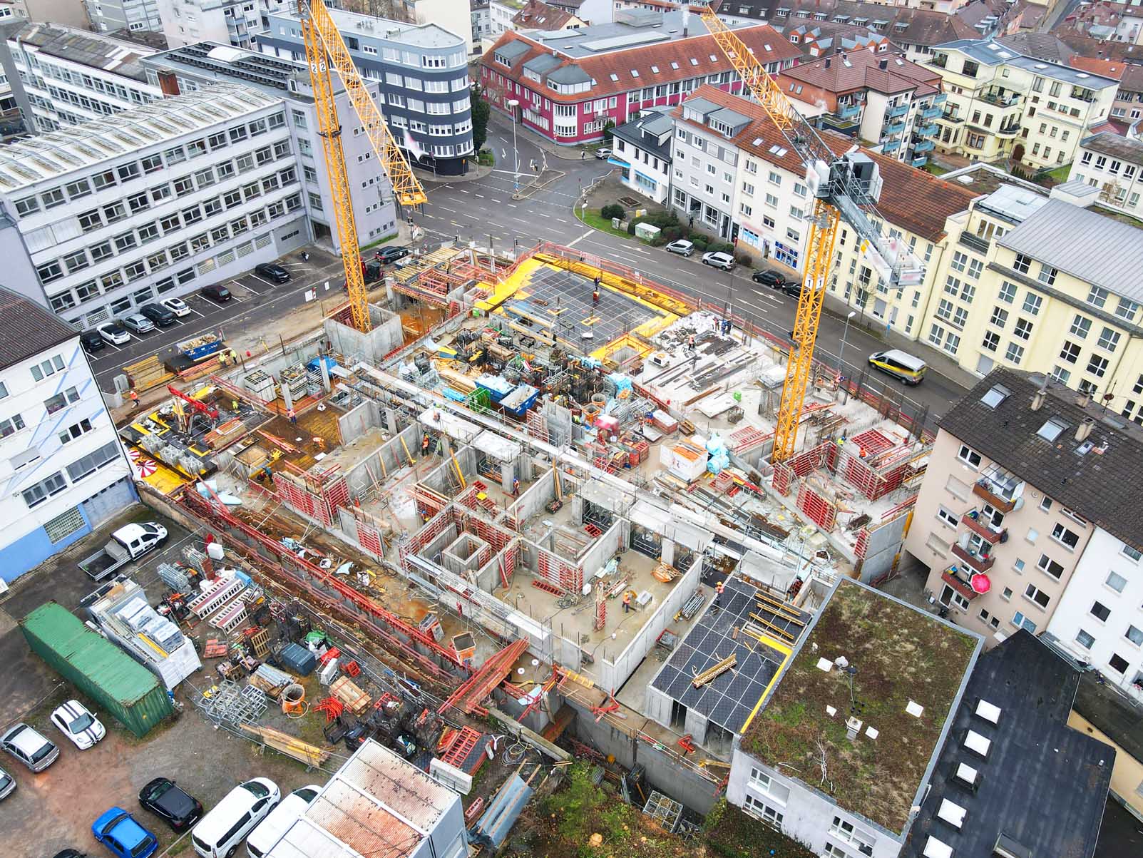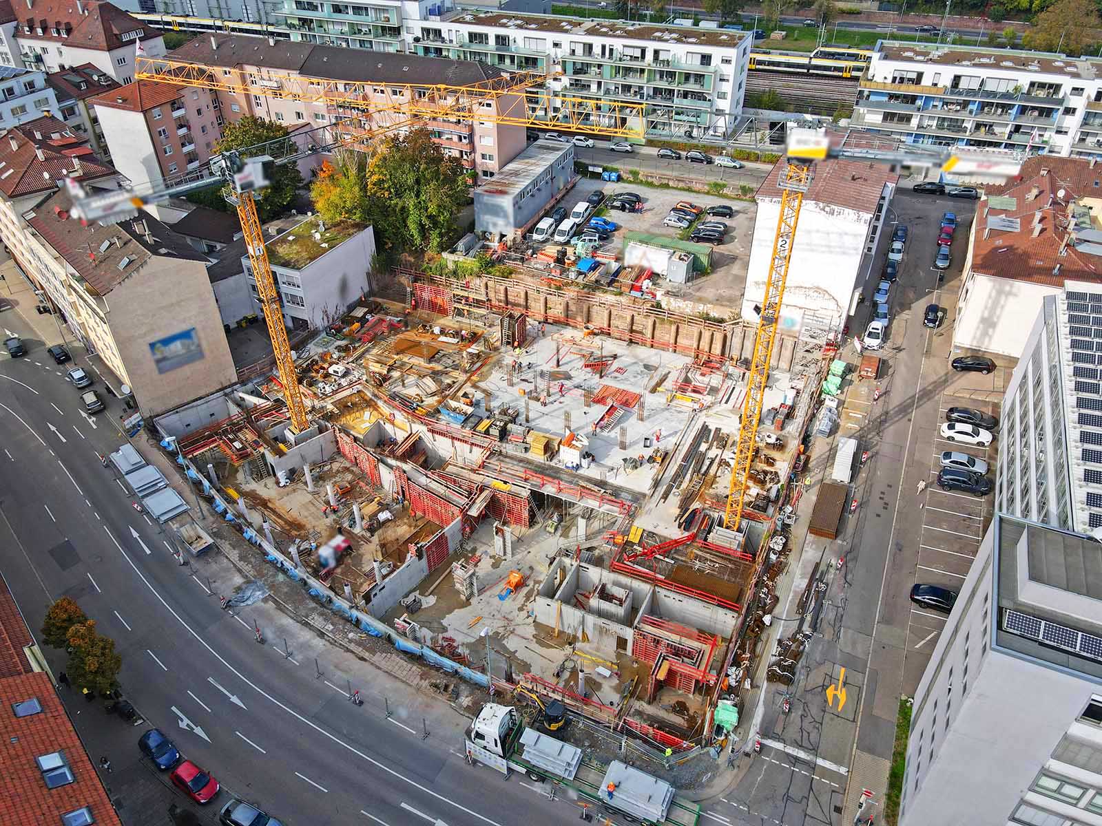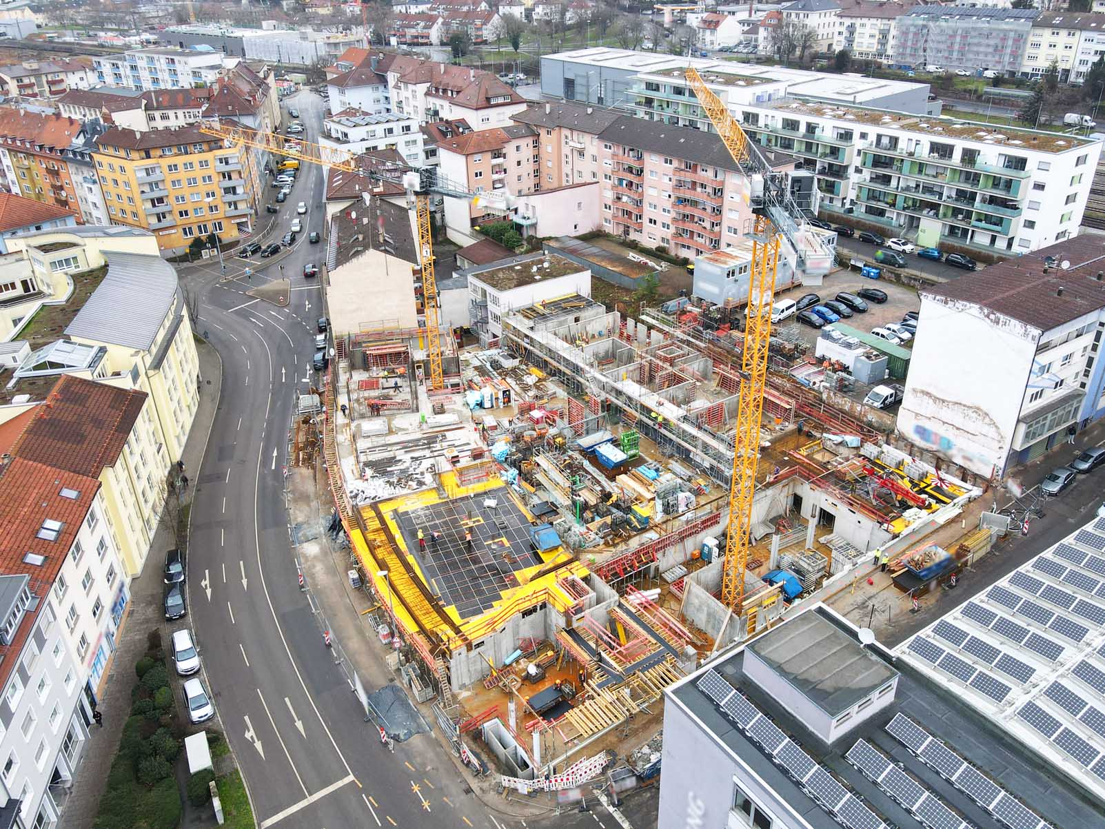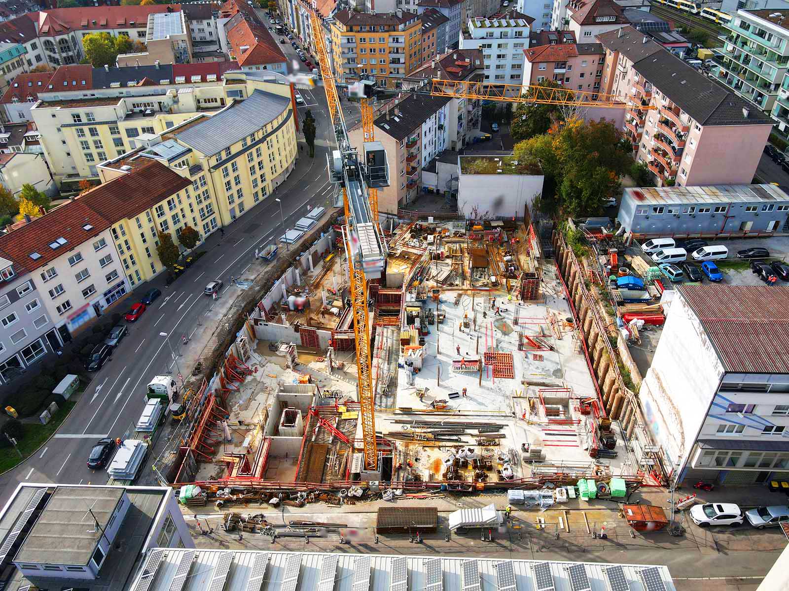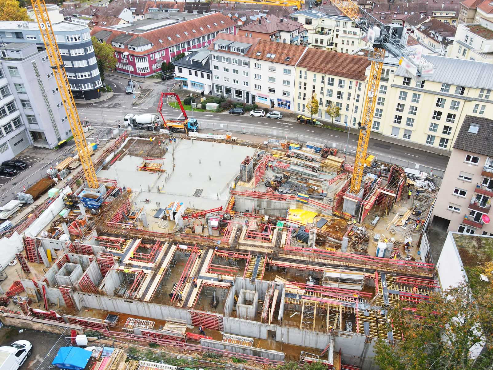 In Pforzheimer Innenstadtbereich entsteht auf dem Eckgrundstück Durlacher Straße/Belfortstraße ein neuer Gebäudekomplex für eine gemischte Nutzung aus Wohnen und Gewerbe und einer 1 1/2 geschossigen Tiefgarage.