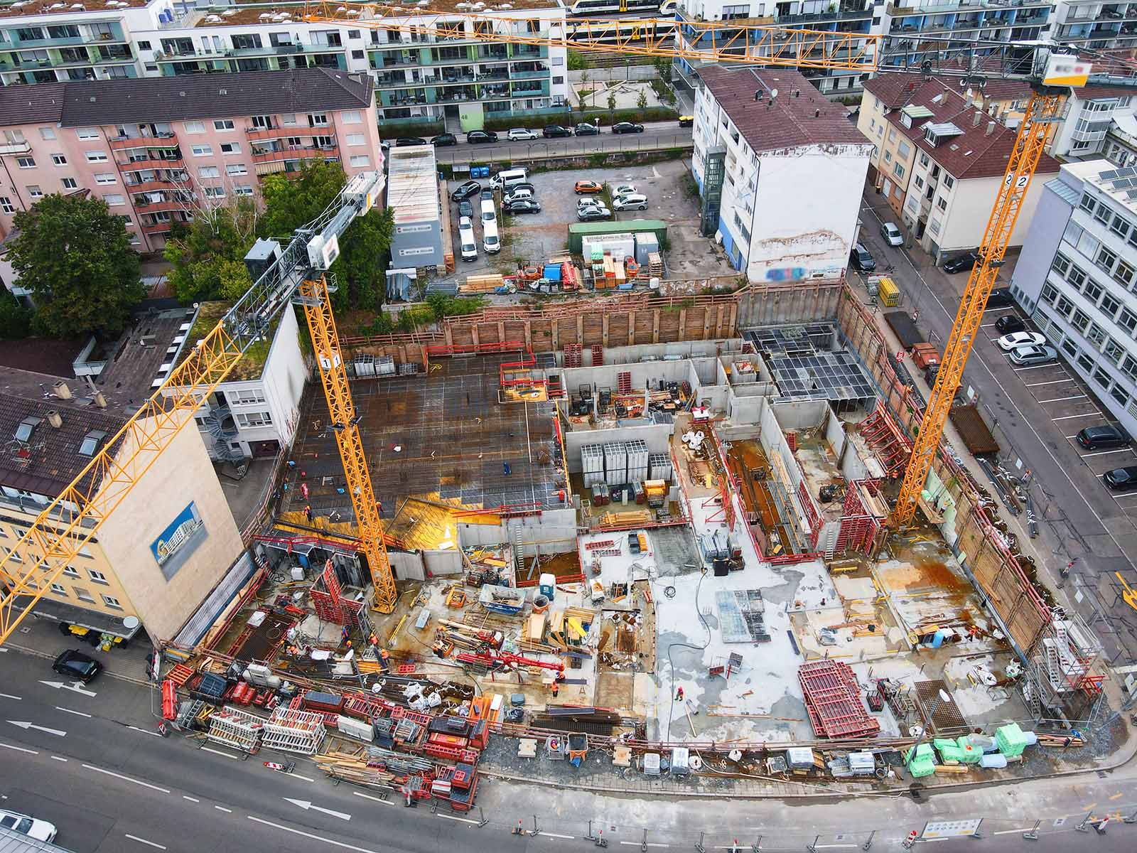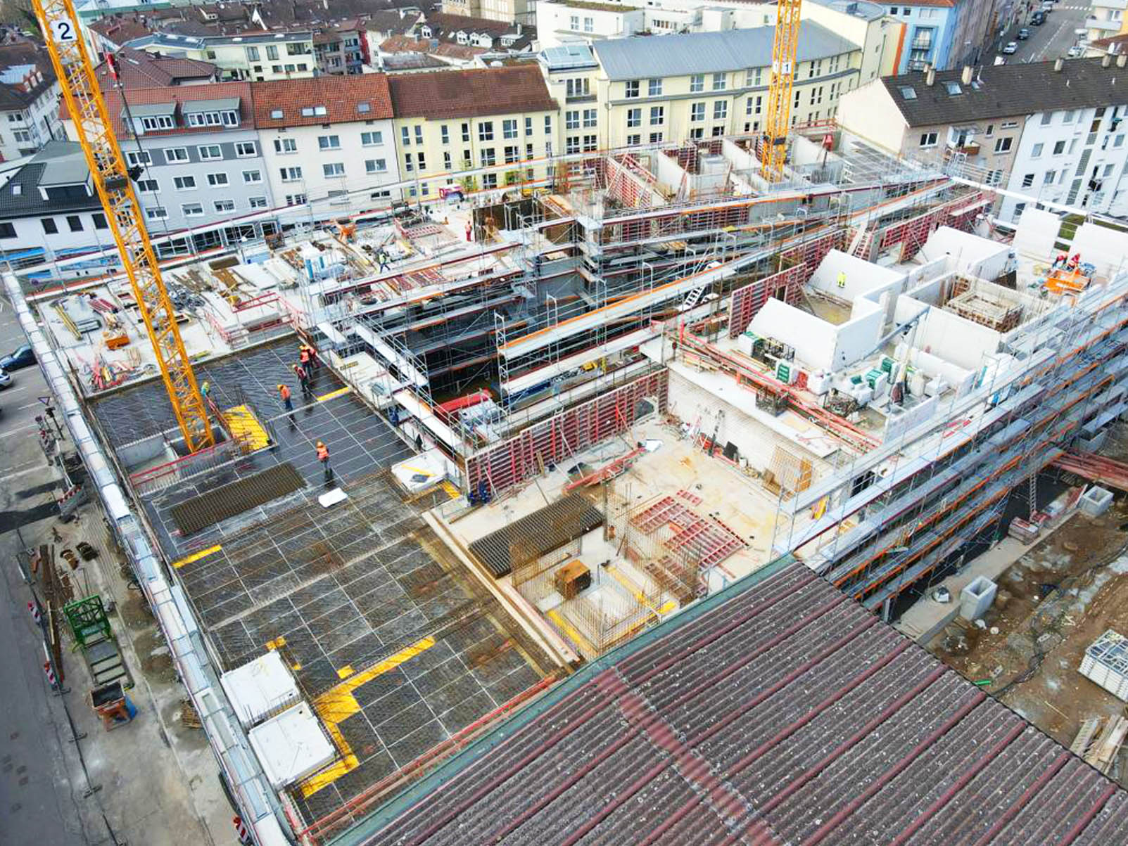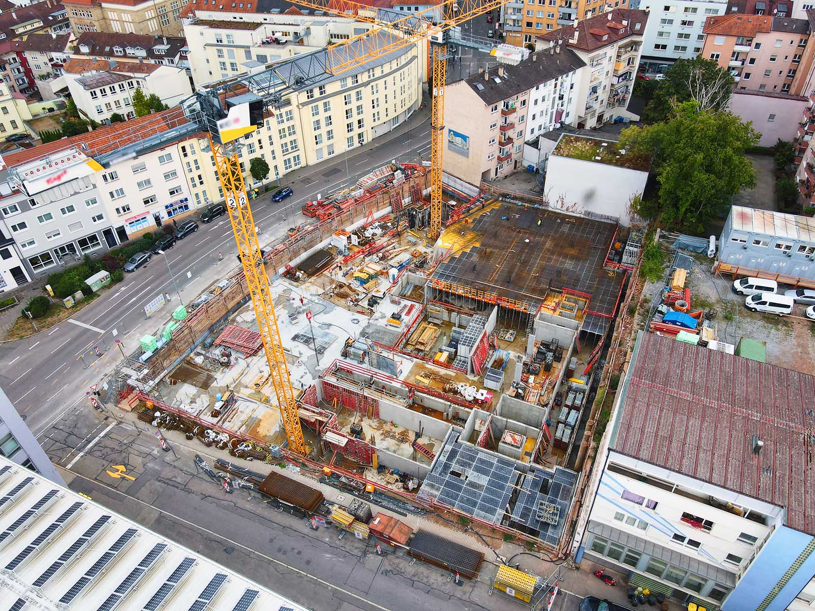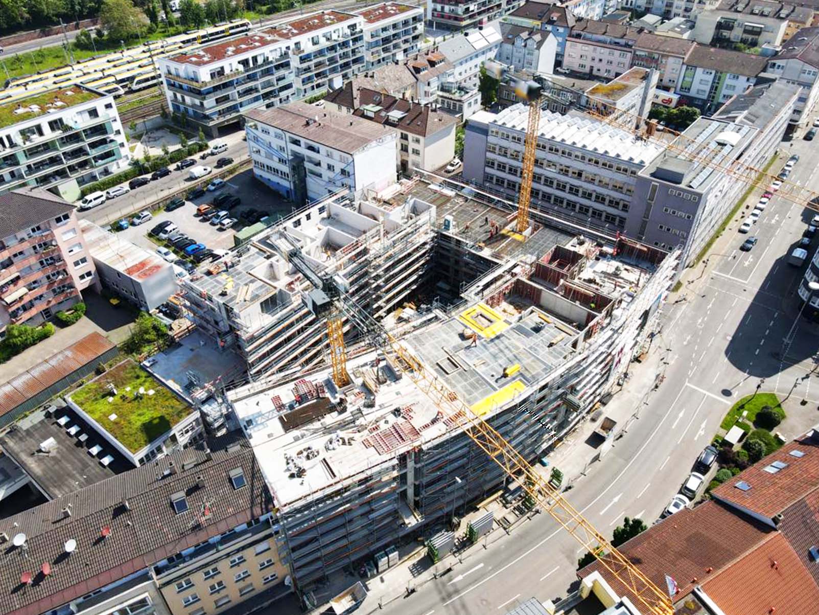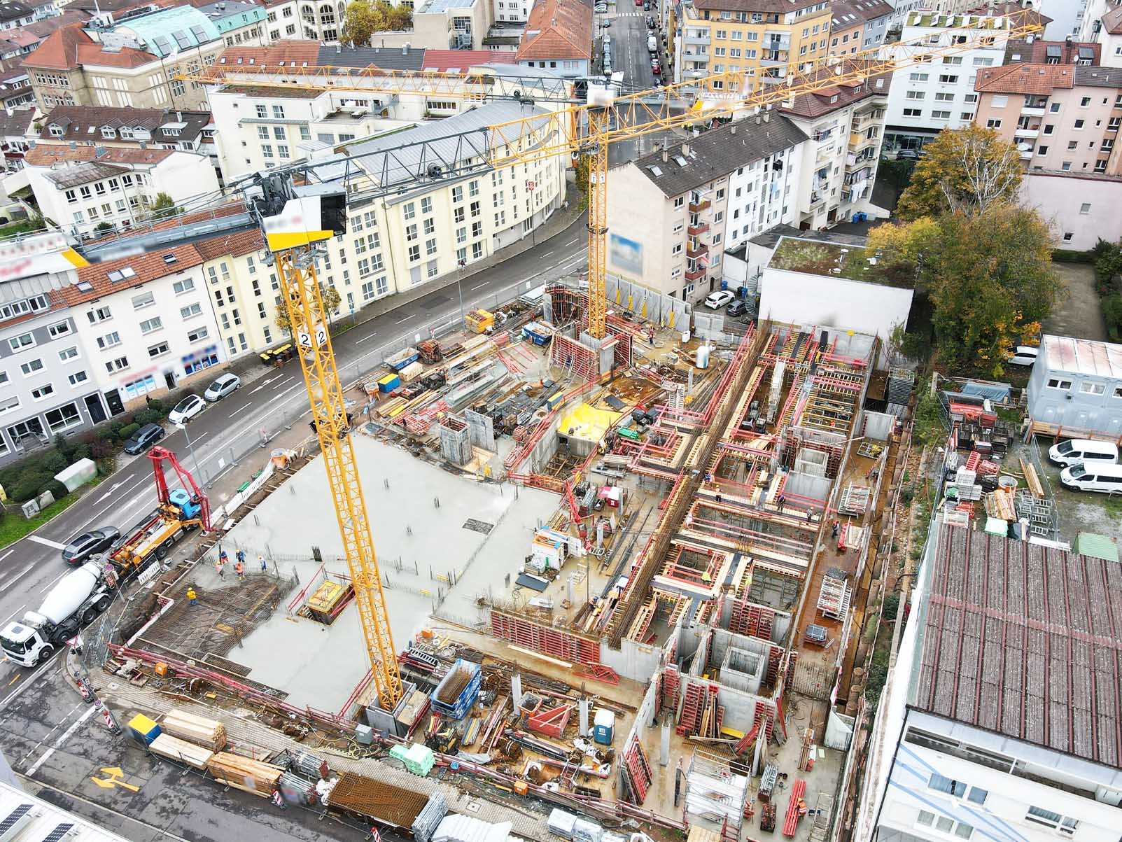 In Pforzheimer Innenstadtbereich entsteht auf dem Eckgrundstück Durlacher Straße/Belfortstraße ein neuer Gebäudekomplex für eine gemischte Nutzung aus Wohnen und Gewerbe und einer 1 1/2 geschossigen Tiefgarage.
