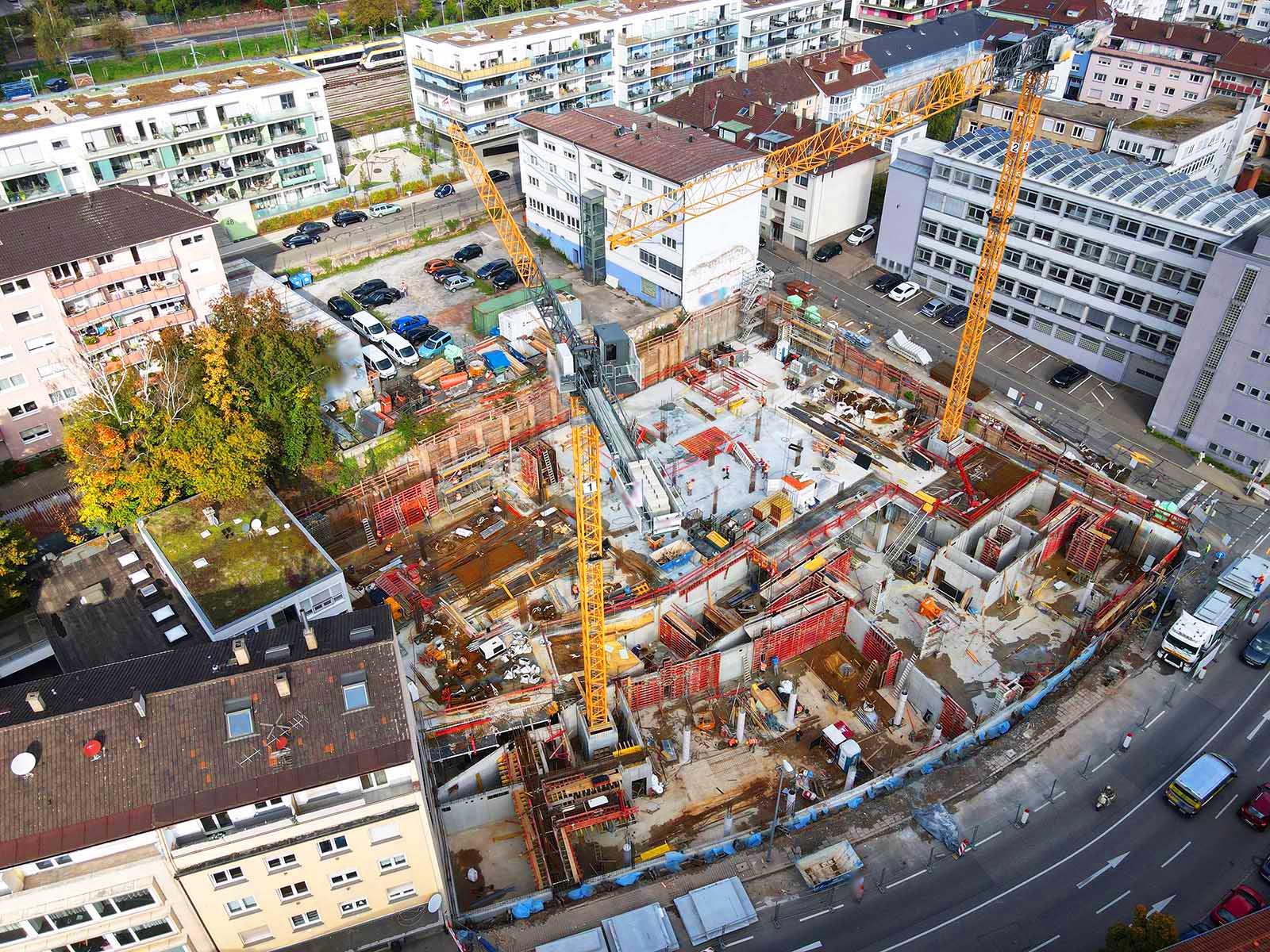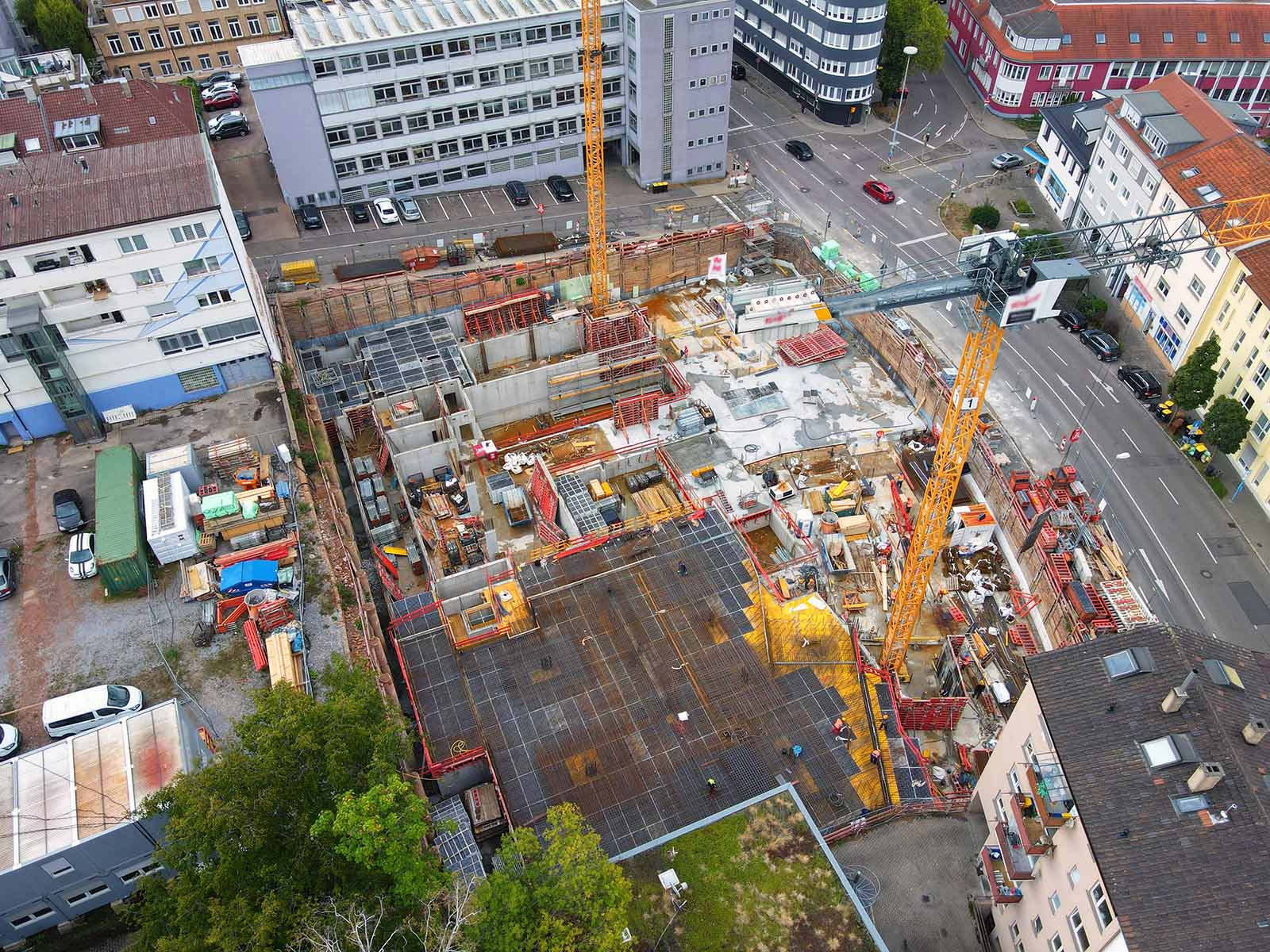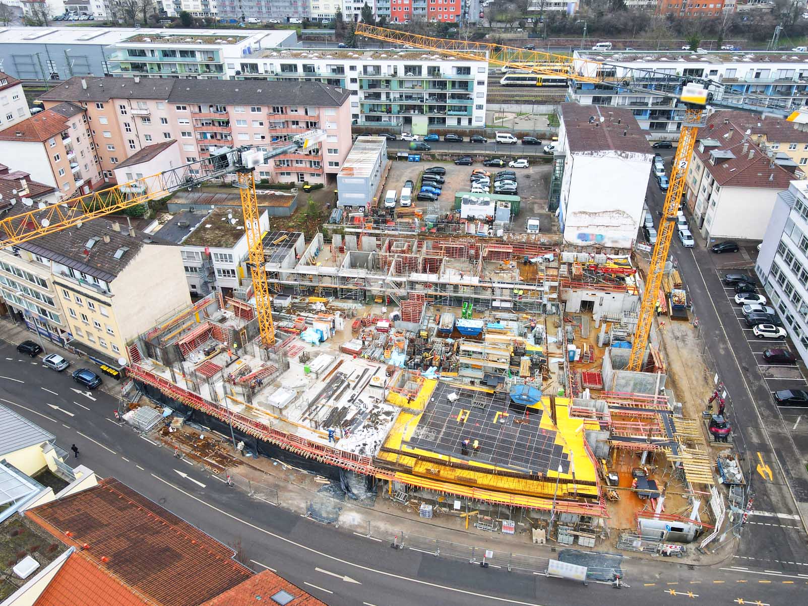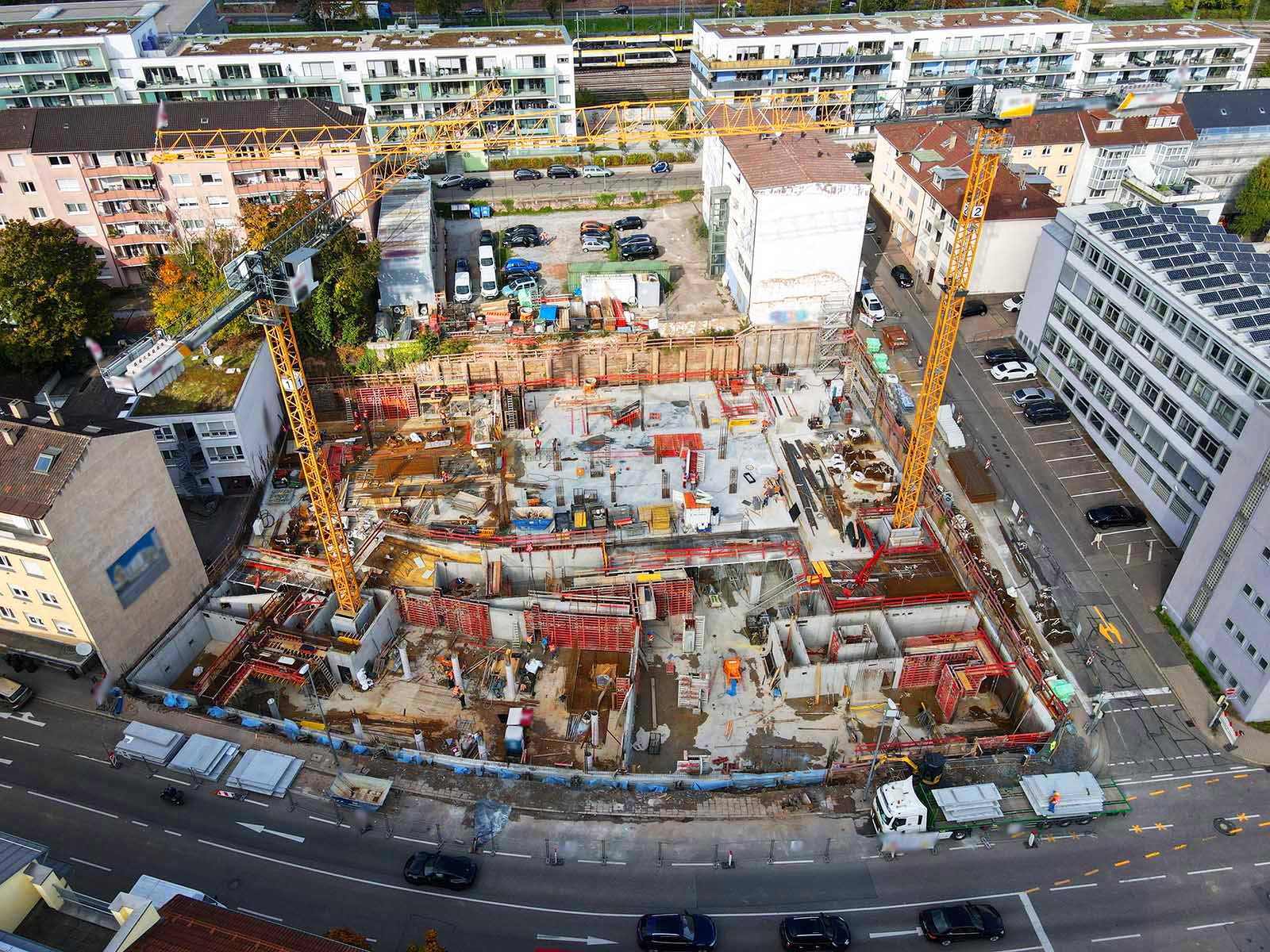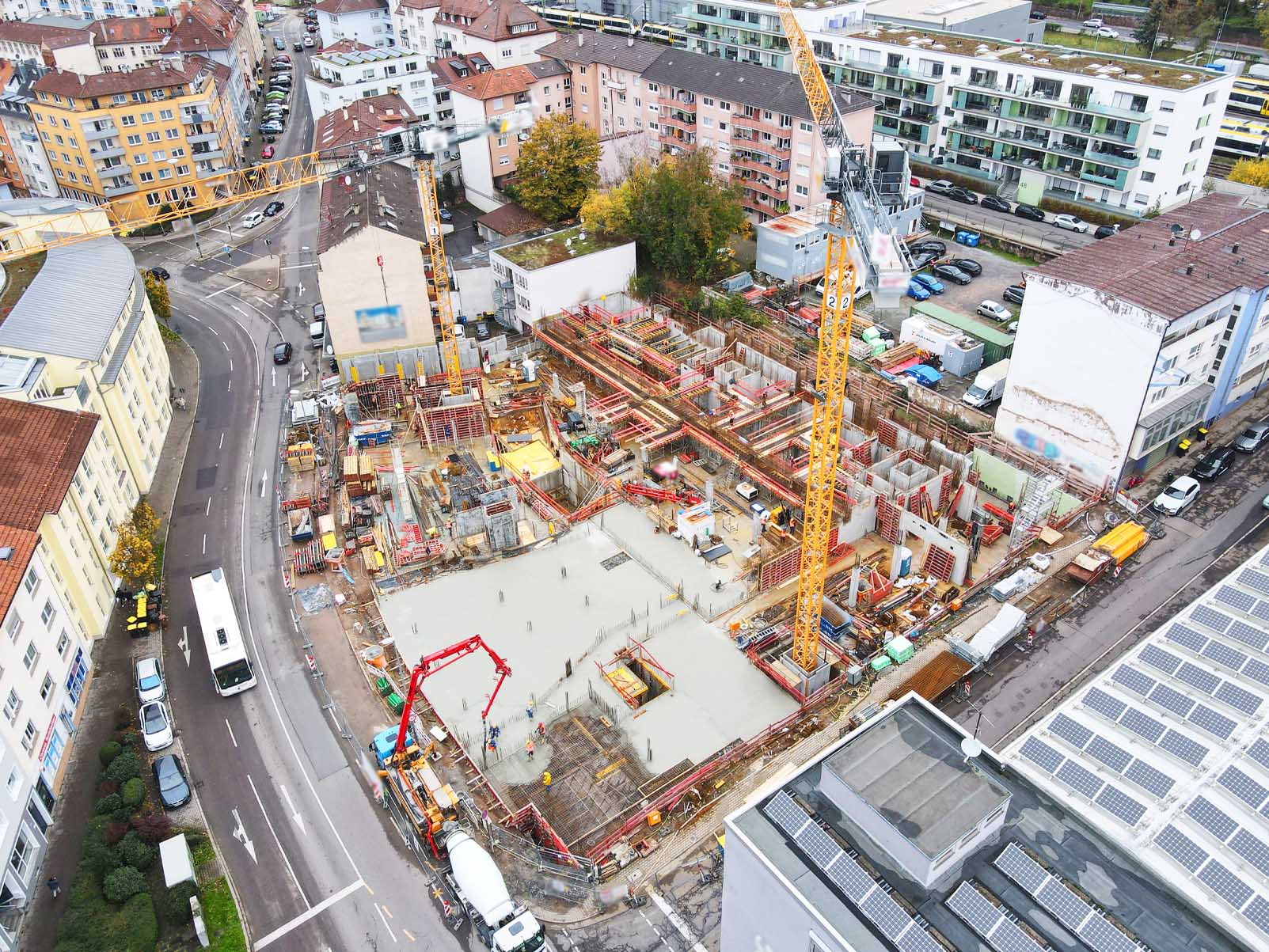 In Pforzheimer Innenstadtbereich entsteht auf dem Eckgrundstück Durlacher Straße/Belfortstraße ein neuer Gebäudekomplex für eine gemischte Nutzung aus Wohnen und Gewerbe und einer 1 1/2 geschossigen Tiefgarage.