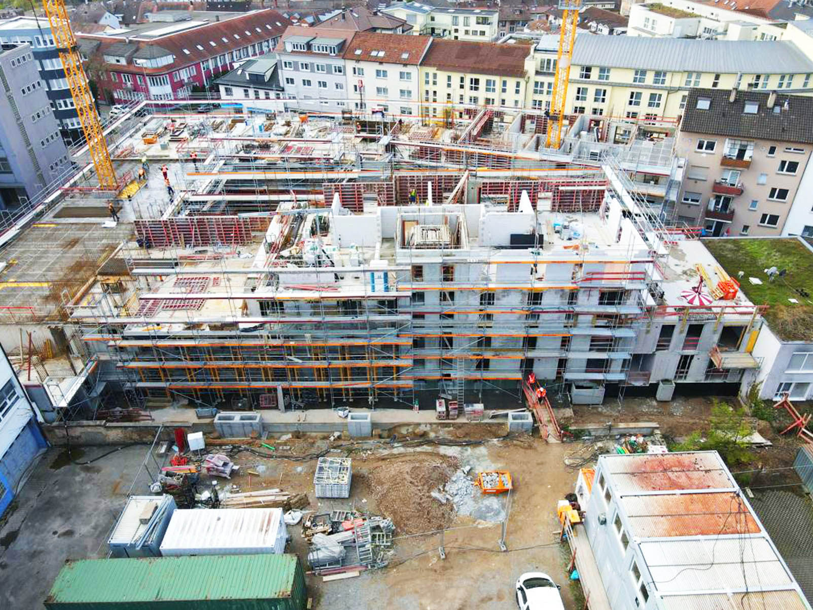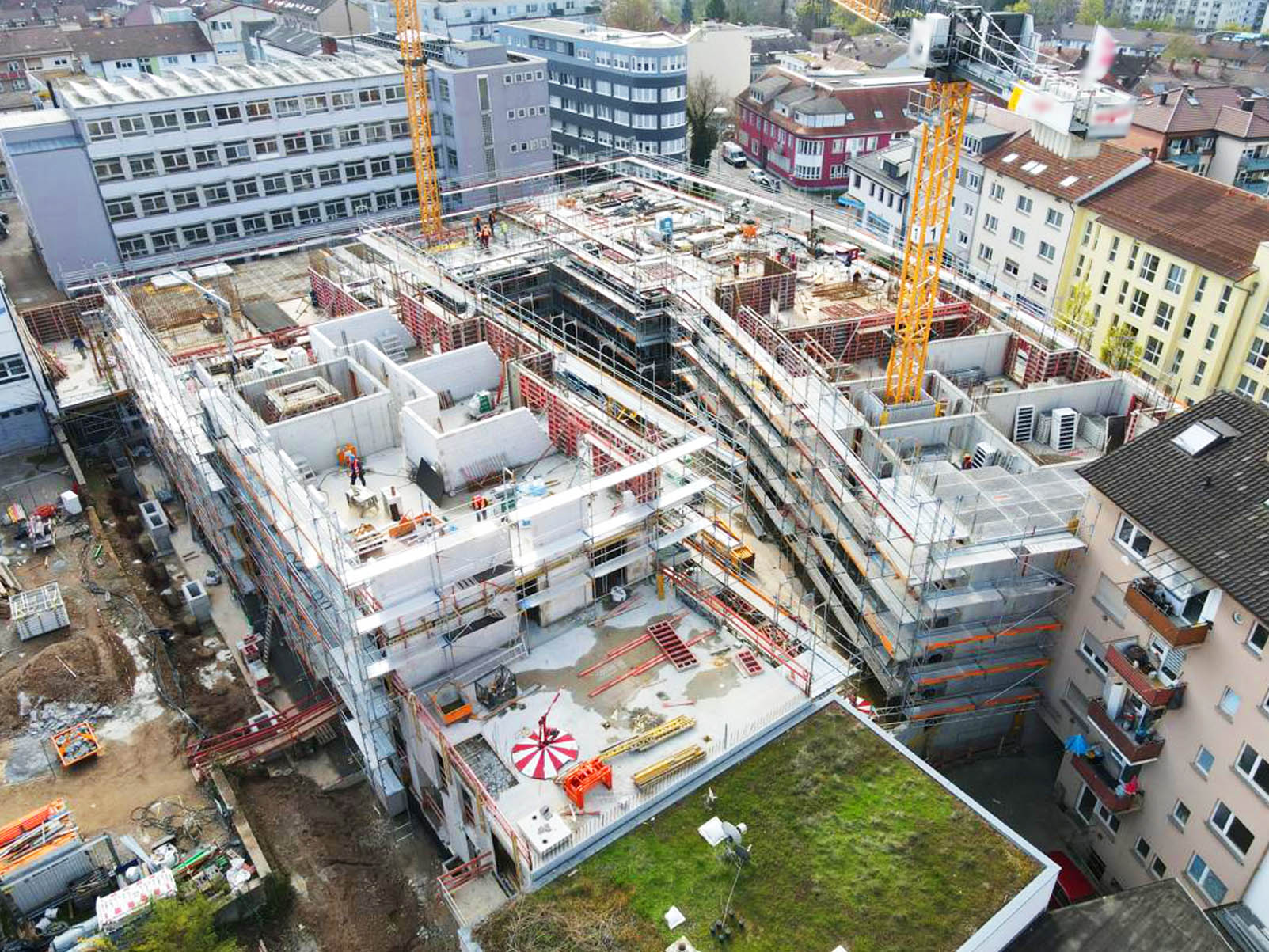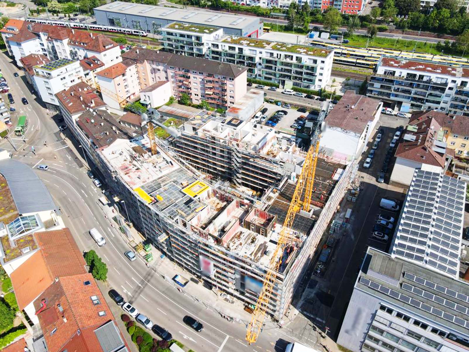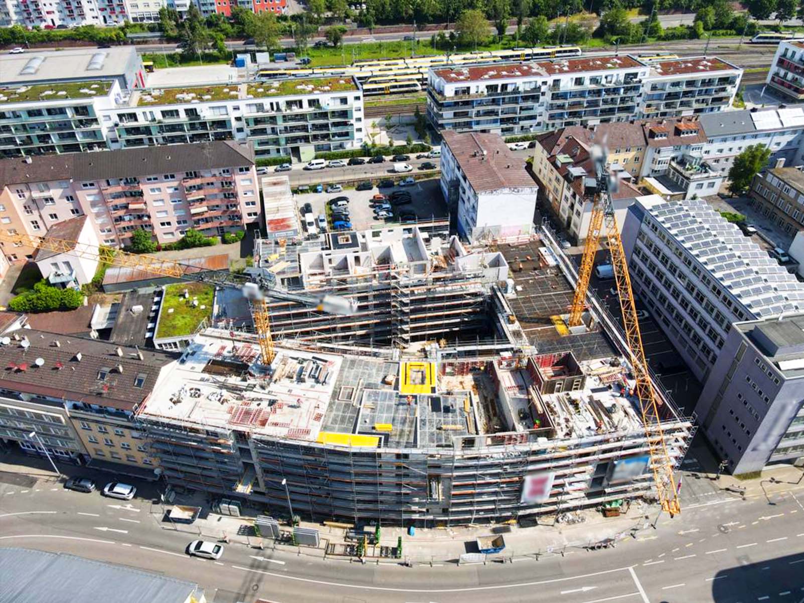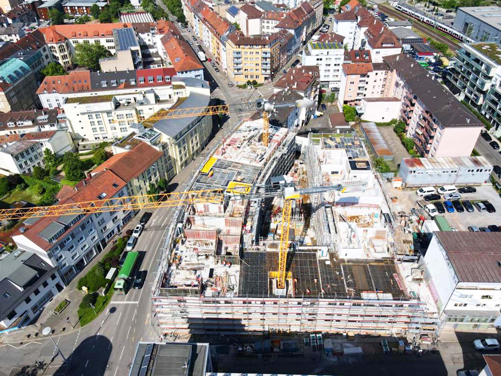 In Pforzheimer Innenstadtbereich entsteht auf dem Eckgrundstück Durlacher Straße/Belfortstraße ein neuer Gebäudekomplex für eine gemischte Nutzung aus Wohnen und Gewerbe und einer 1 1/2 geschossigen Tiefgarage.